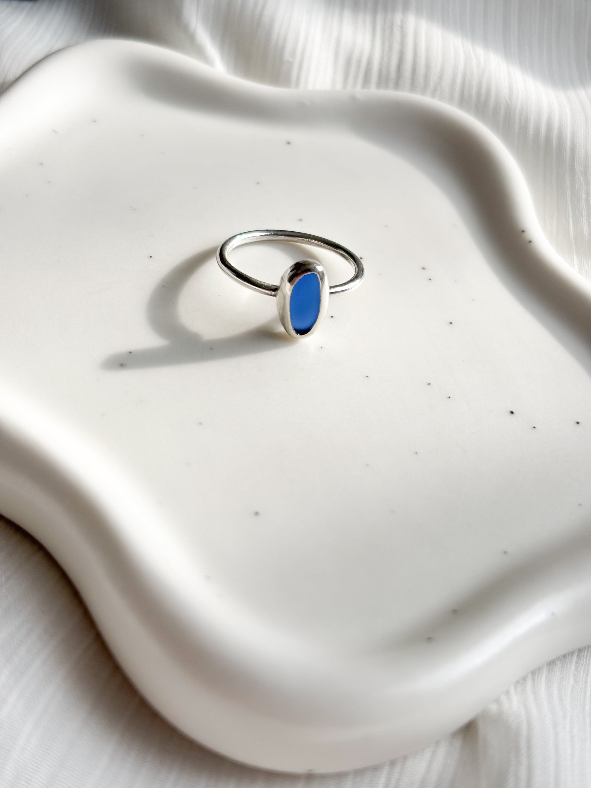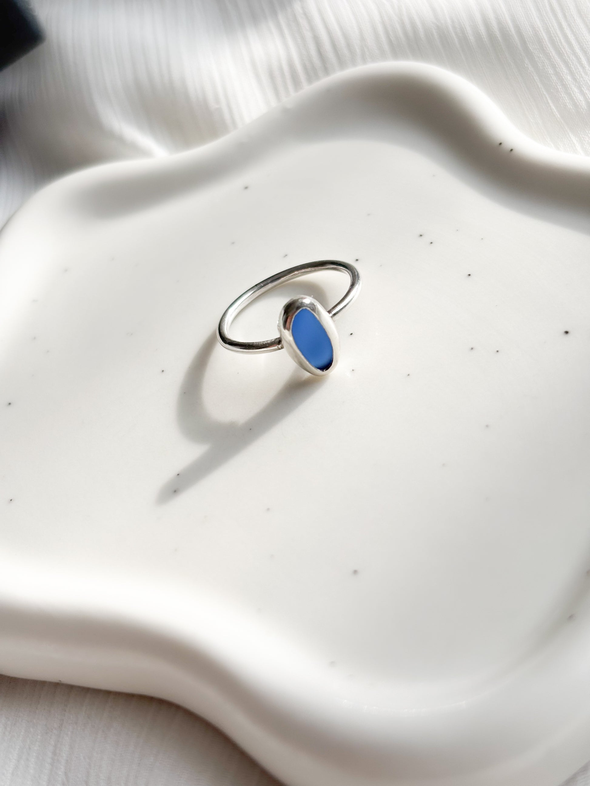 Este anillo nació de un trozo de vidrio marino, pulido por años de movimiento suave y constante. Lo recogí como quien encuentra un susurro del mar, una señal de que incluso en el vaivén de la vida, la calma siempre vuelve.