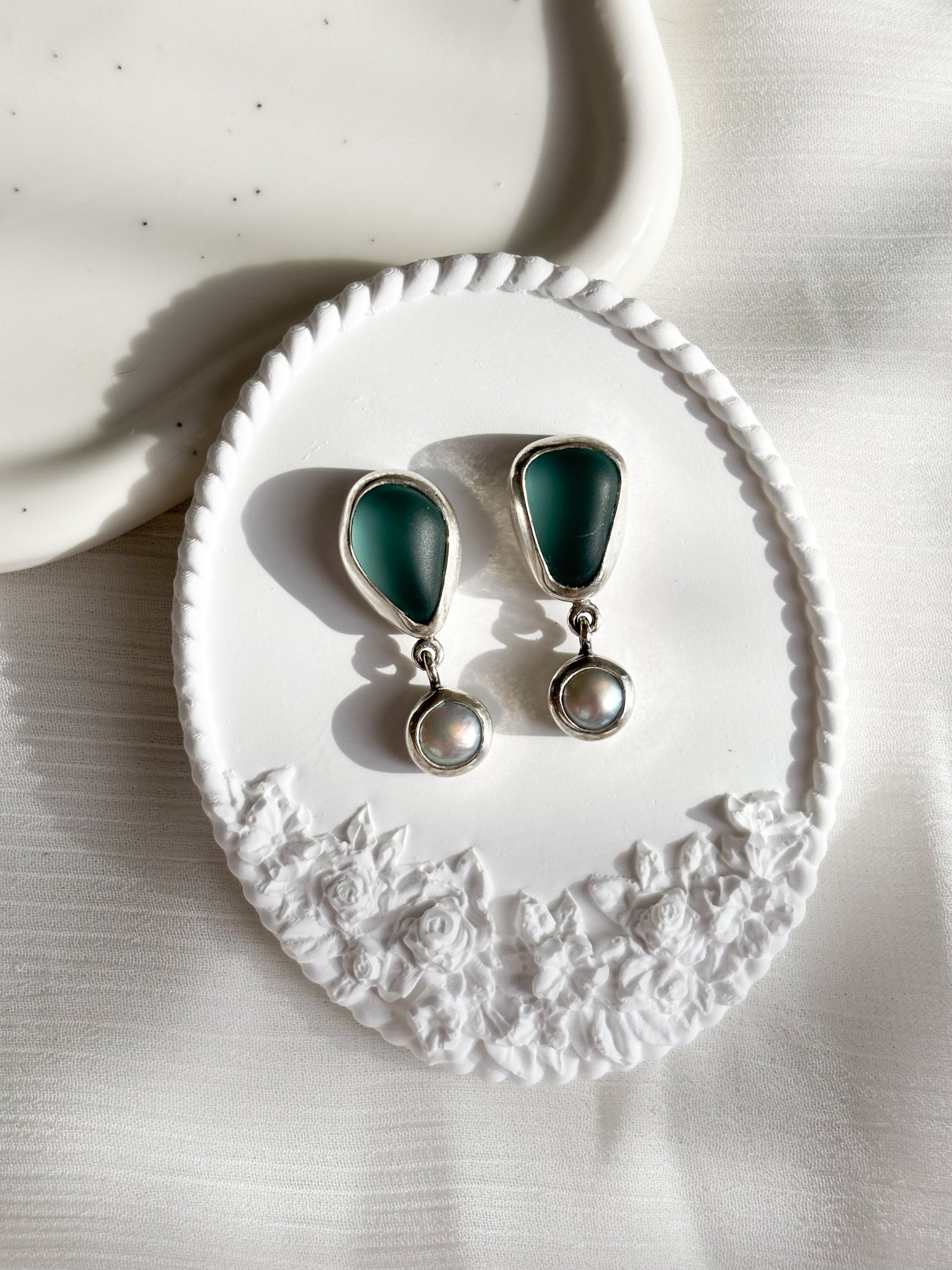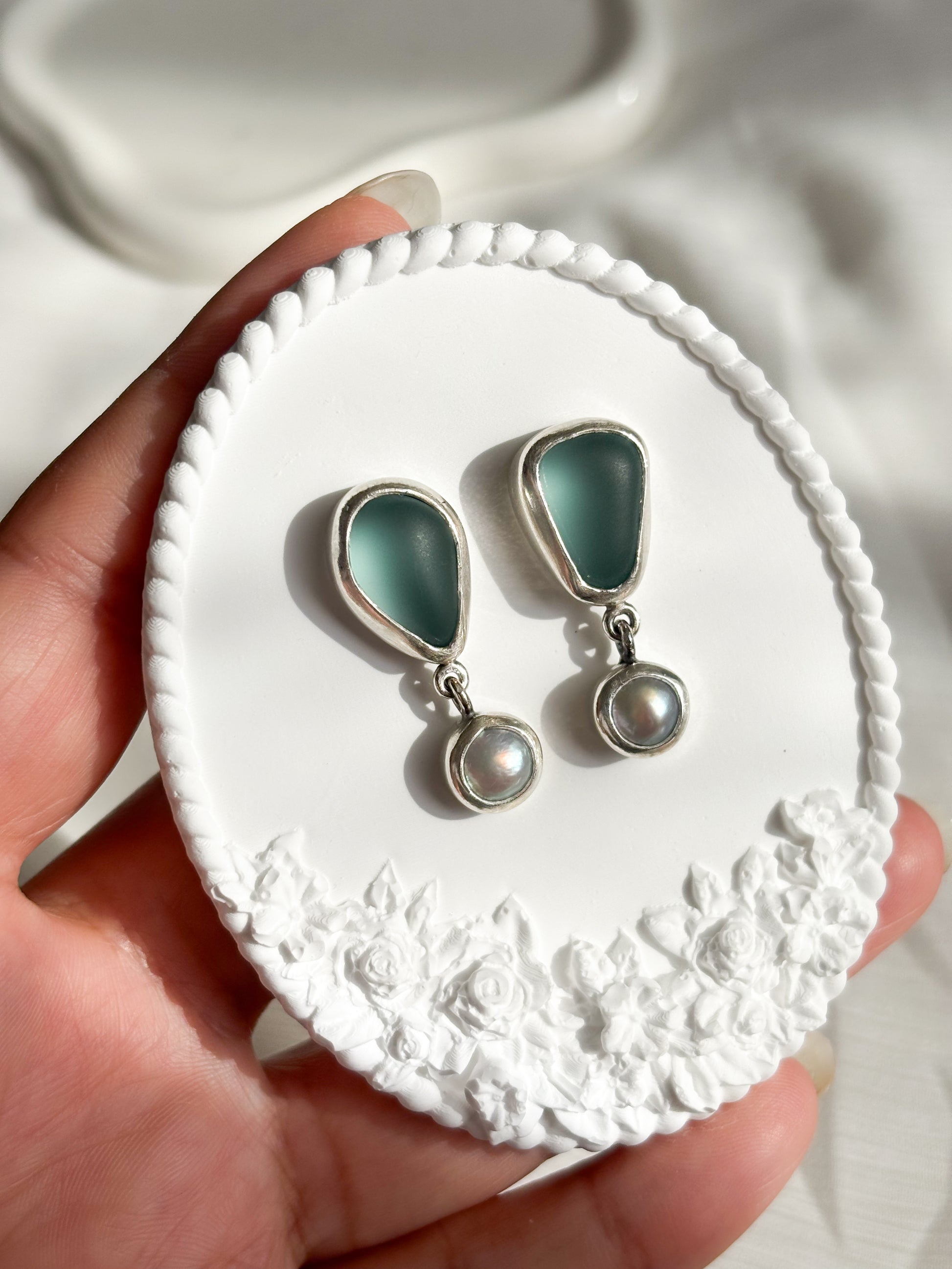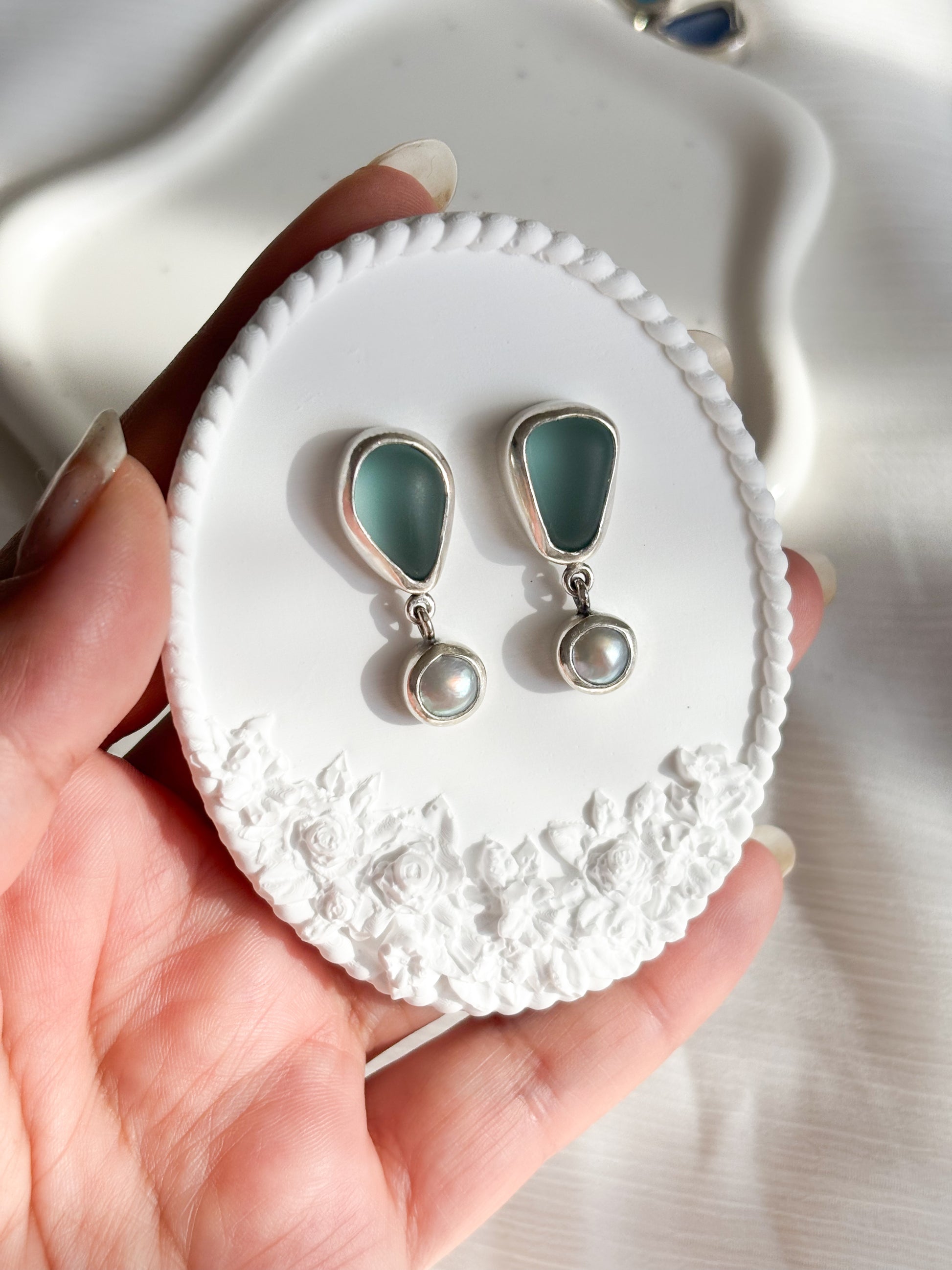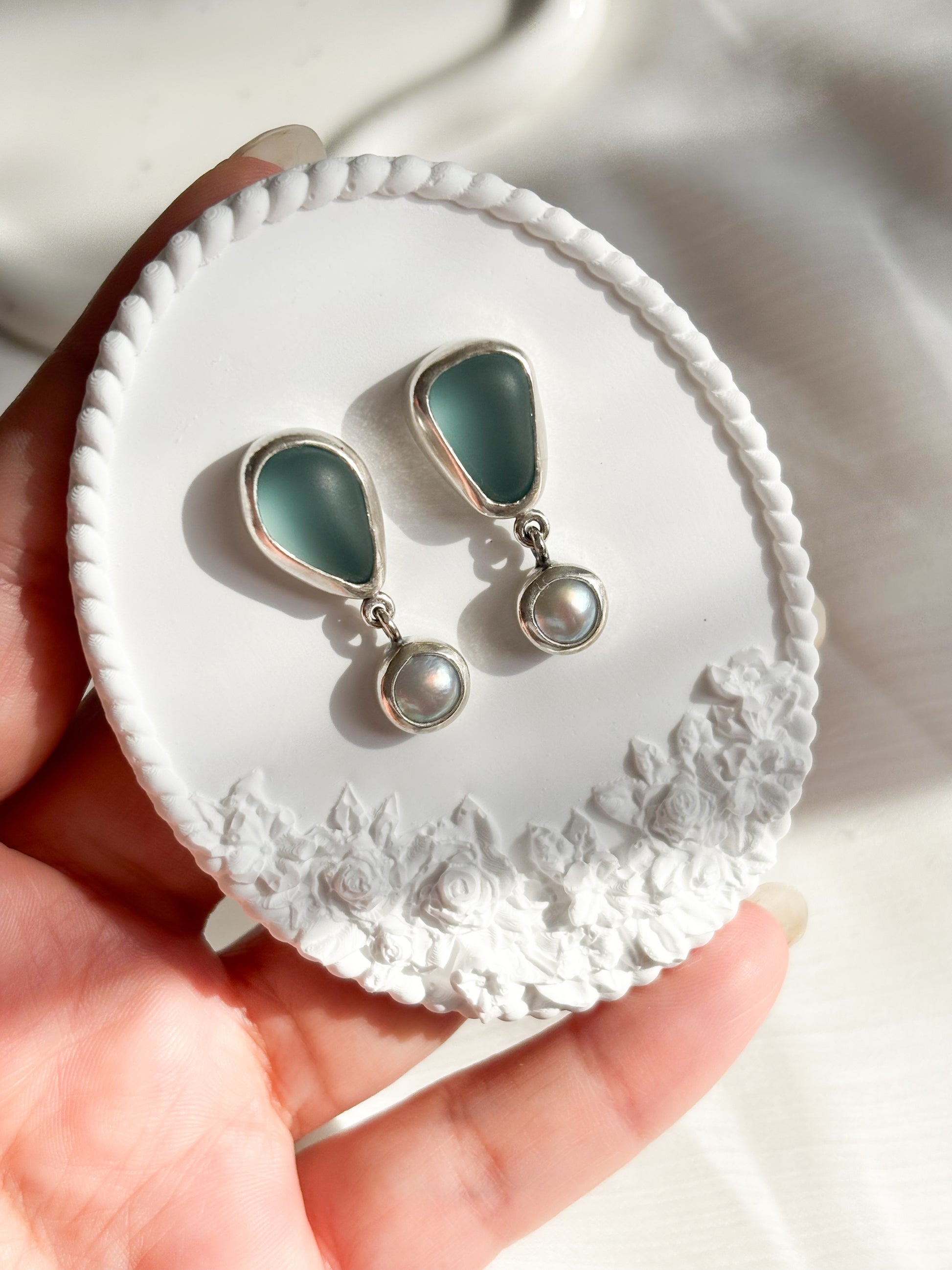 Hechos a mano en plata 950, vidrio marino y perlas naturales