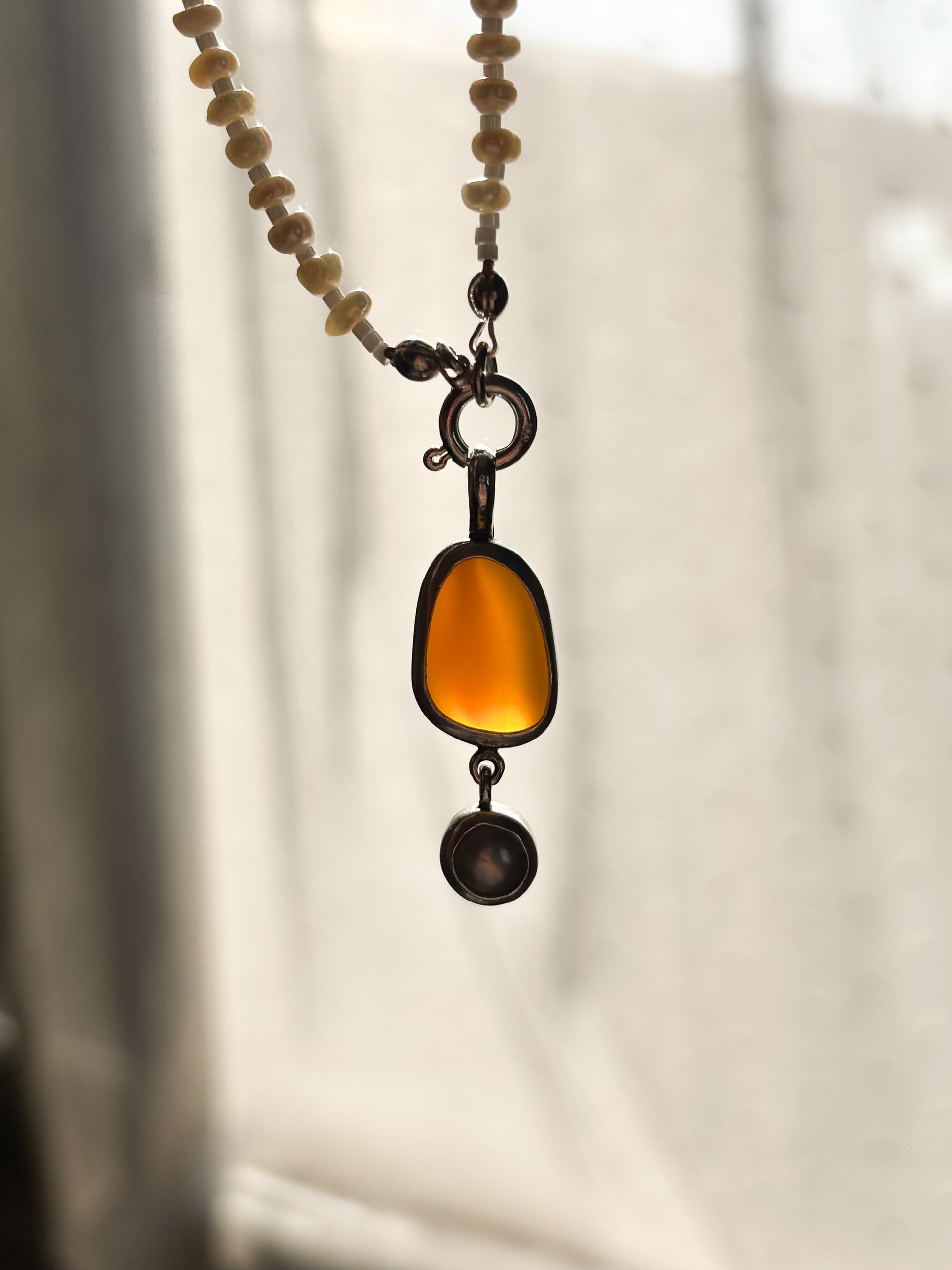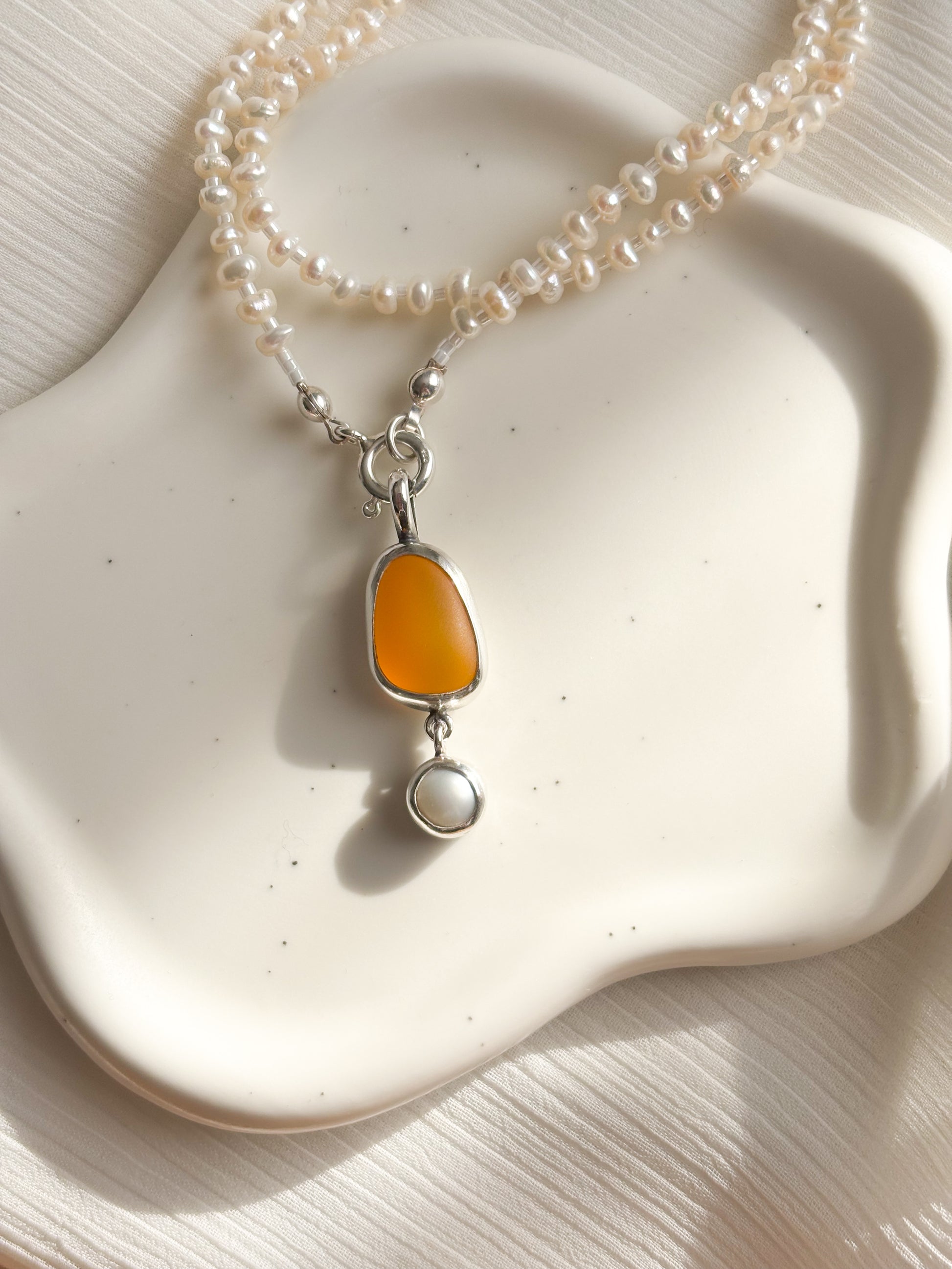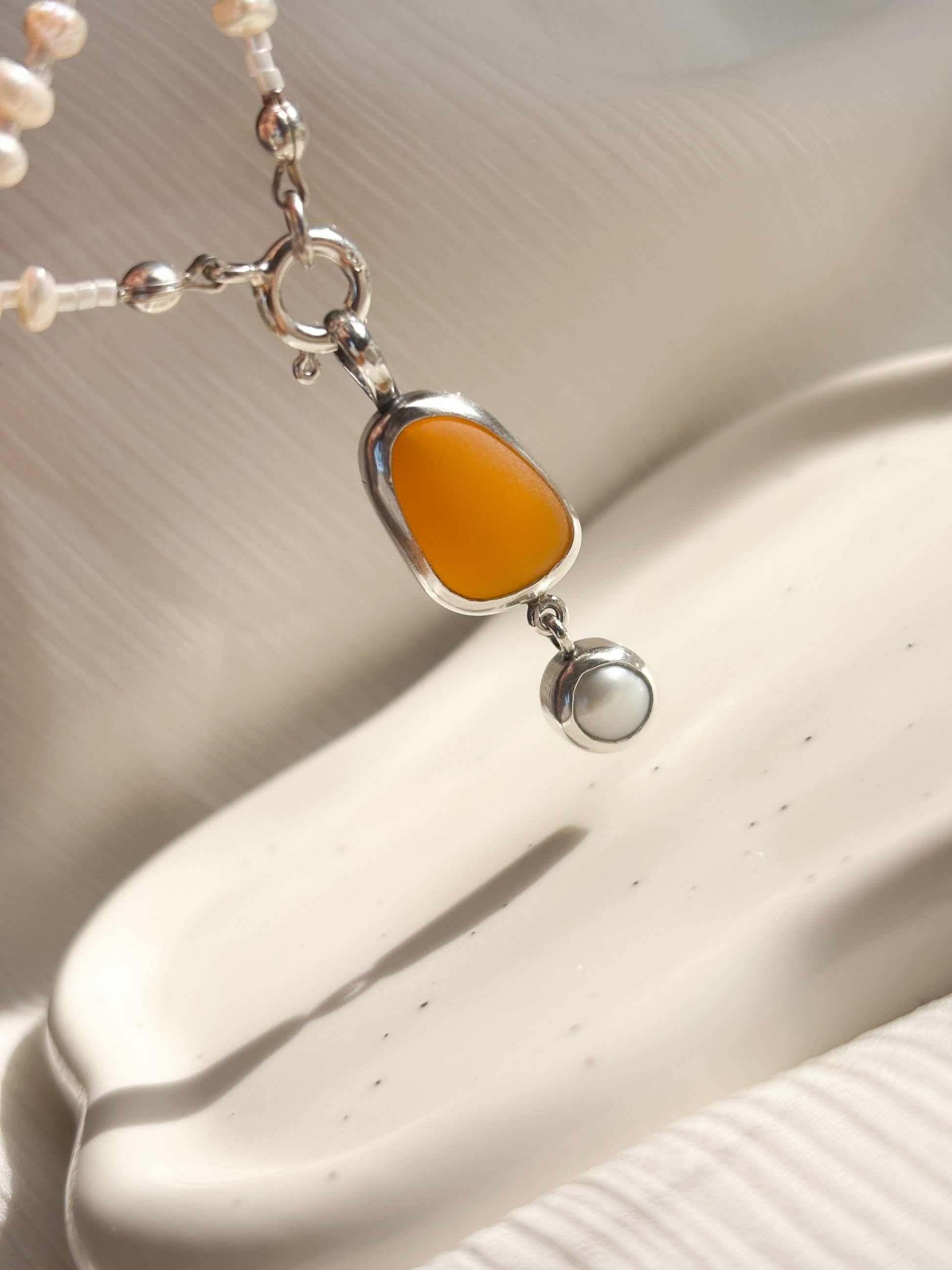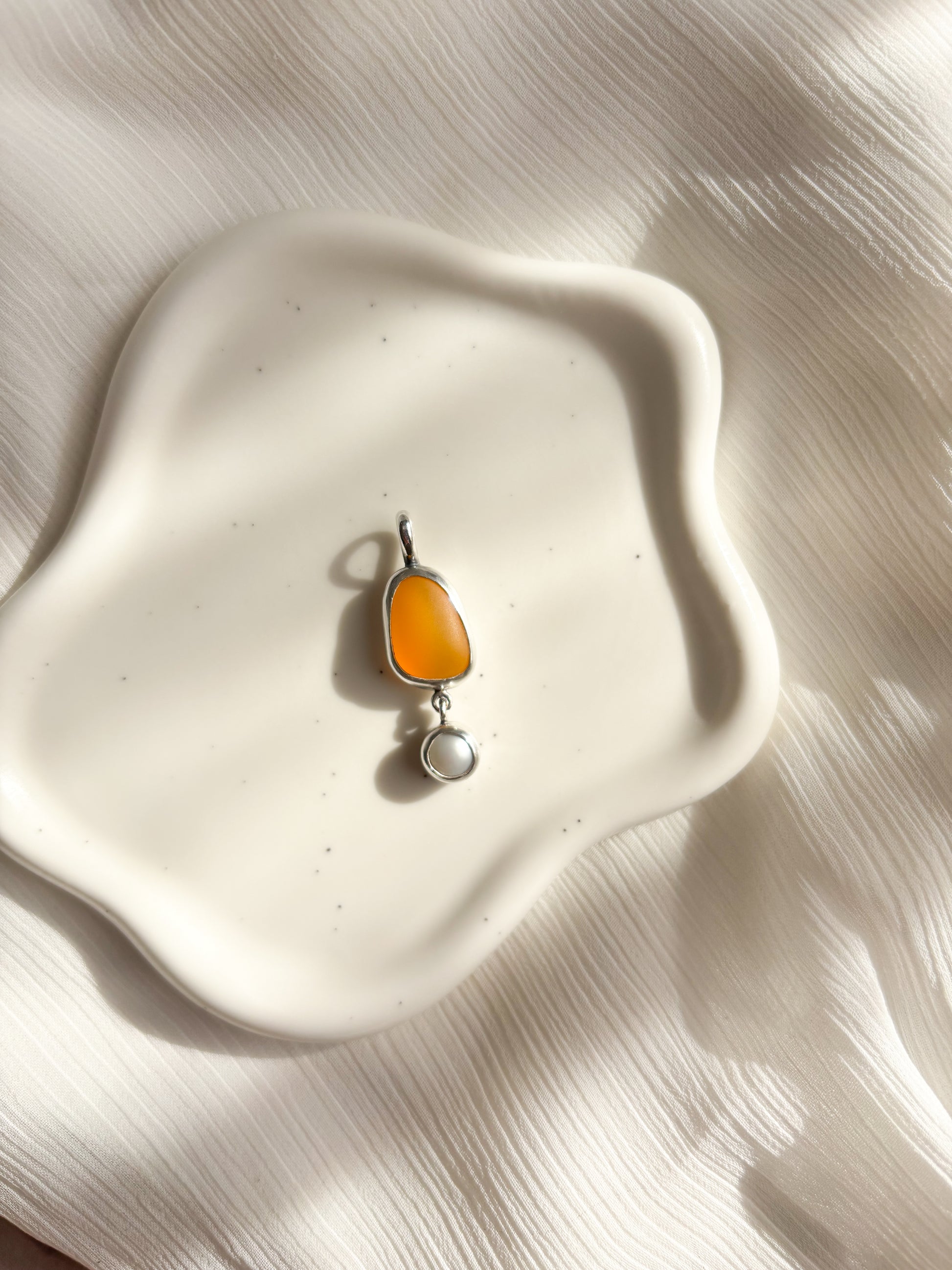 Hechos a mano en plata 950, cada pieza encierra un fragmento de vidrio marino pulido por el tiempo.