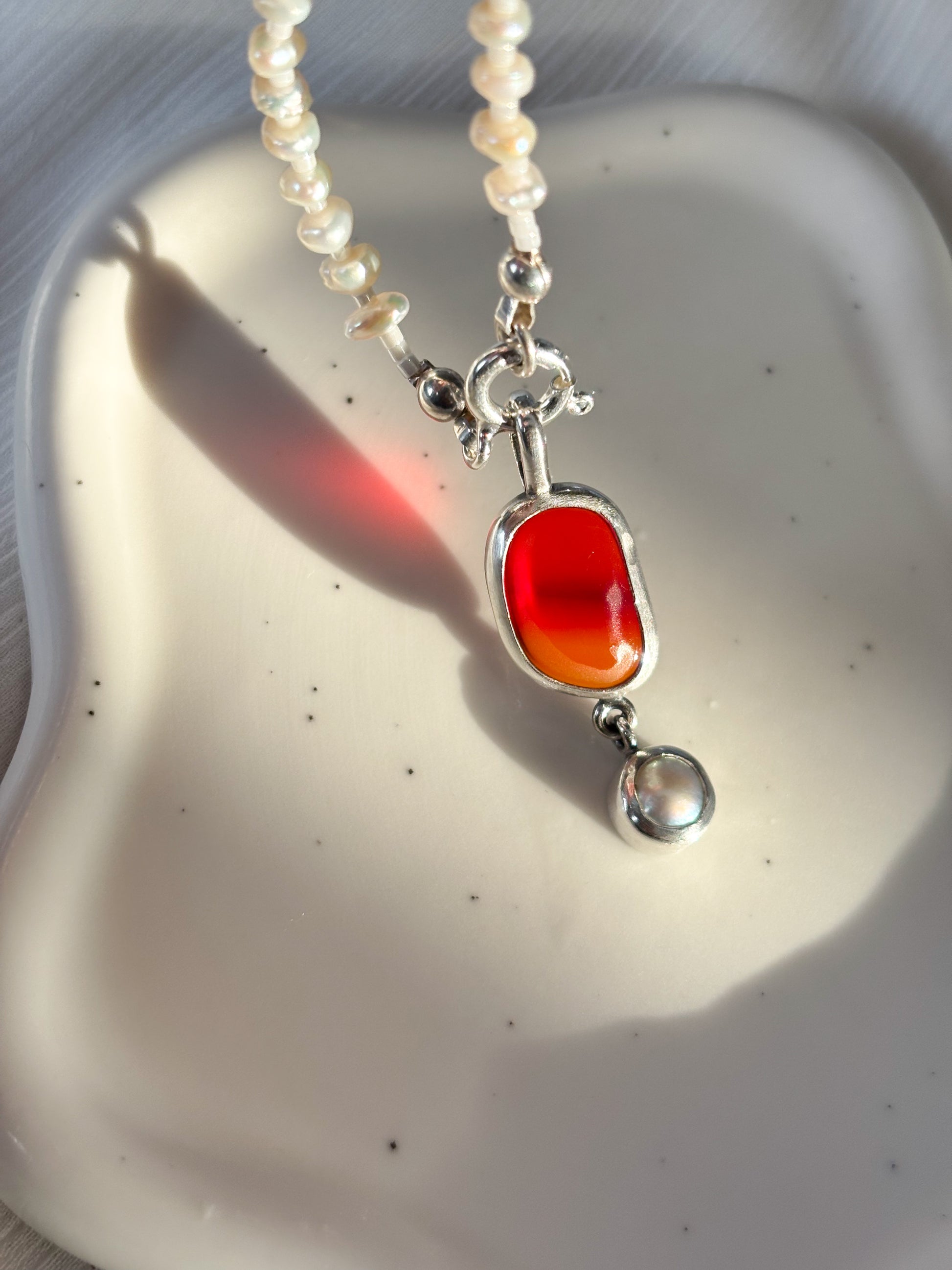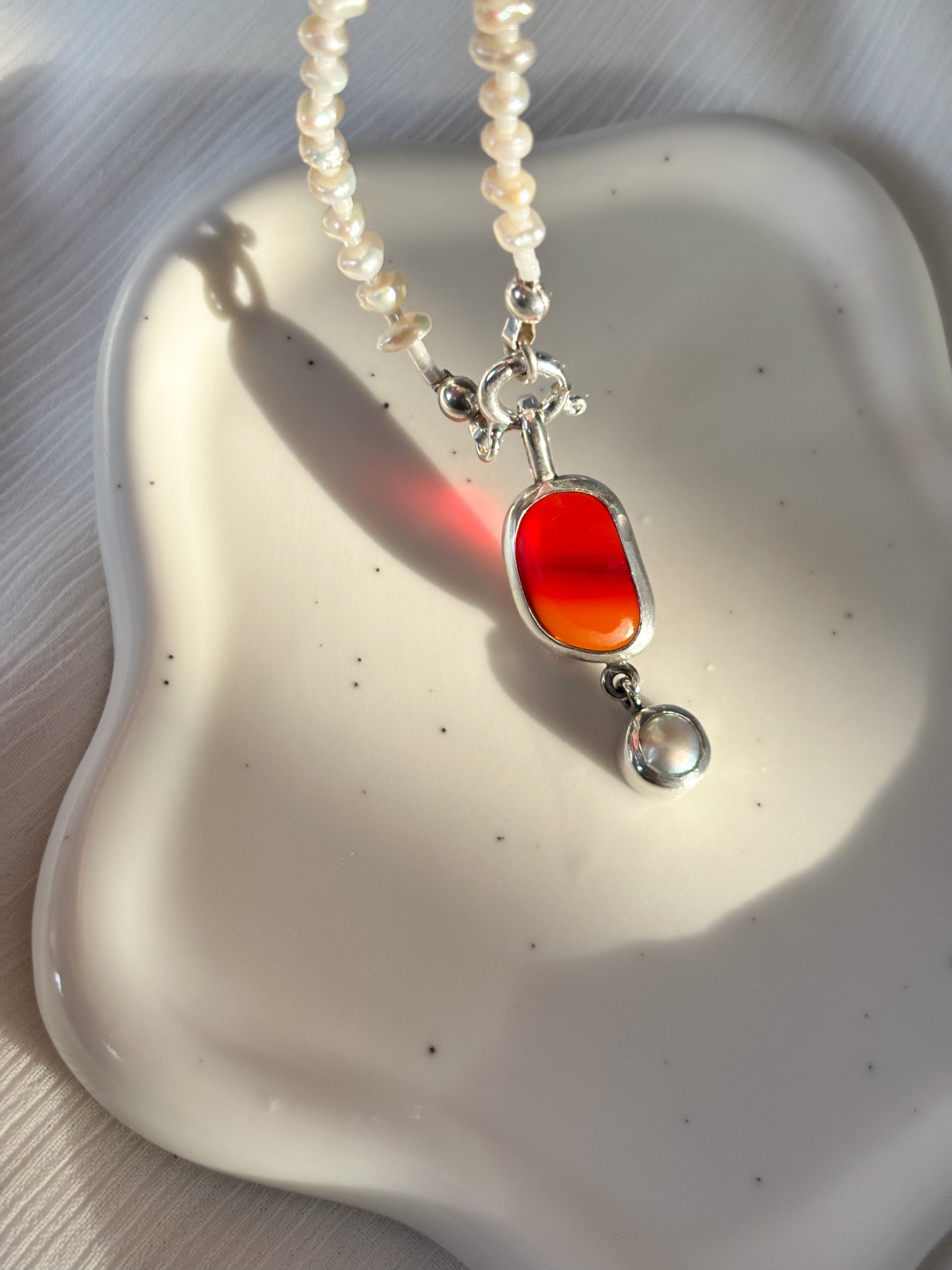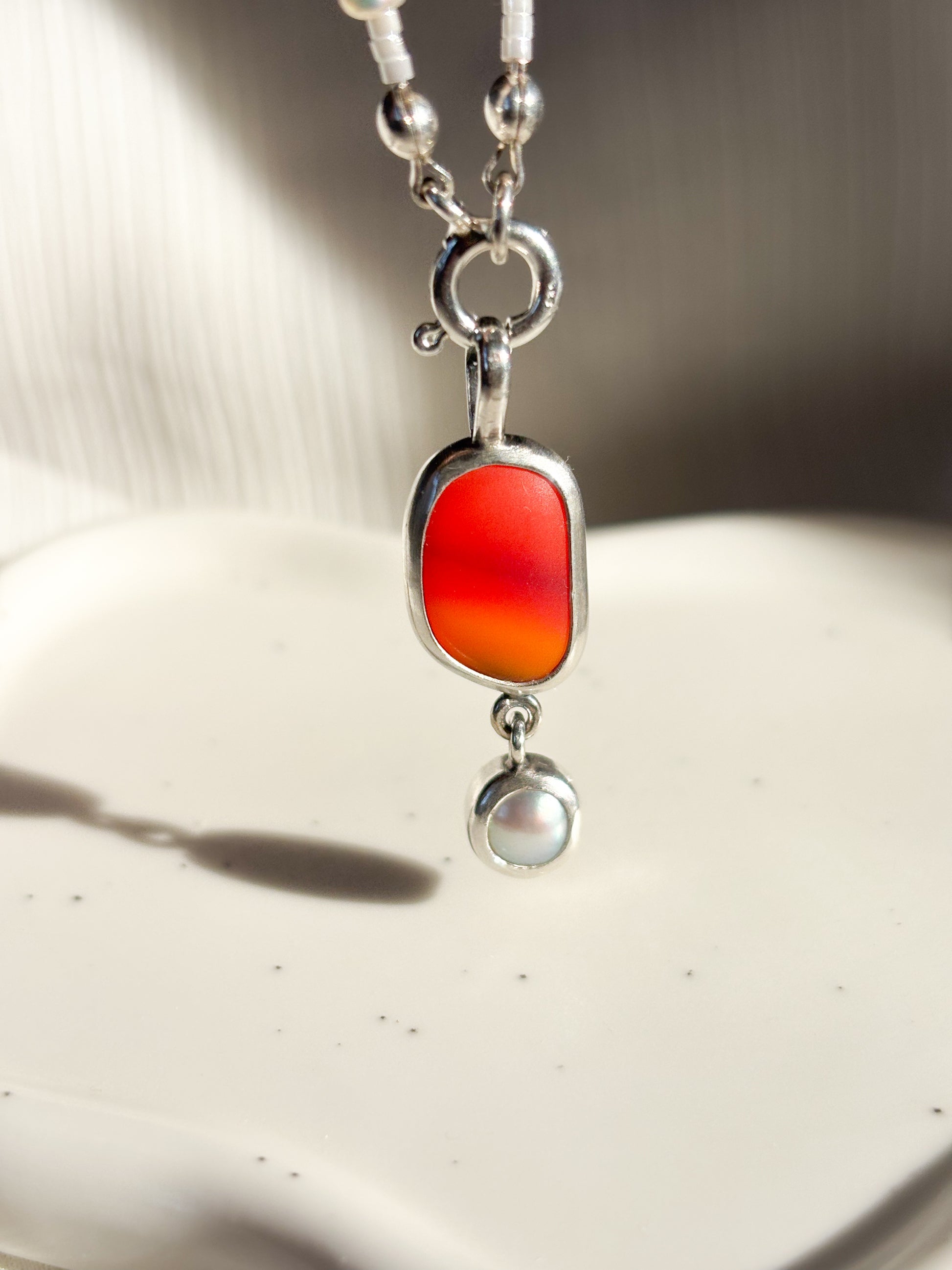 Hechos a mano en plata 950, cada pieza encierra un fragmento de vidrio marino pulido por el tiempo.