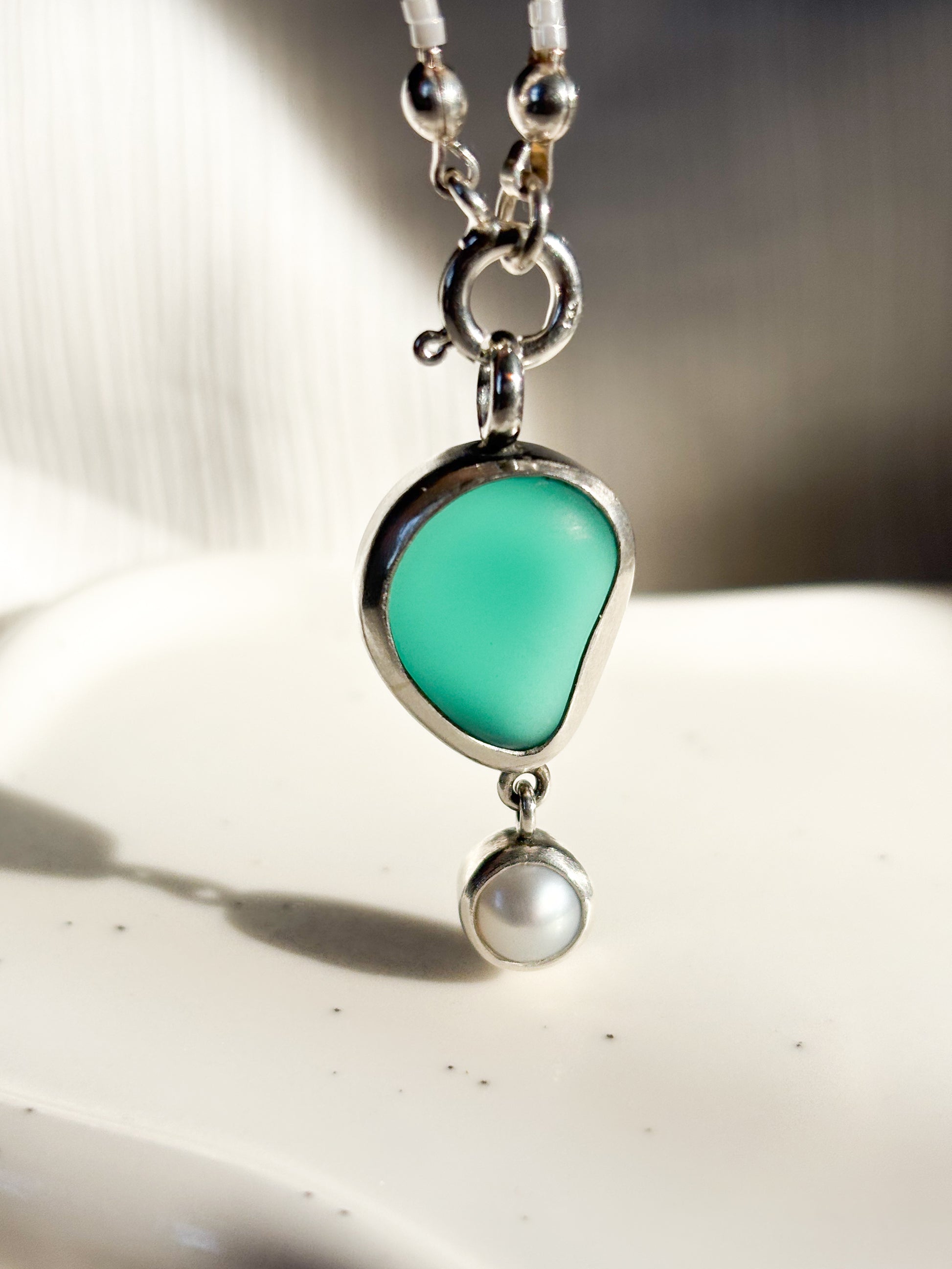 Hechos a mano en plata 950, cada pieza encierra un fragmento de vidrio marino pulido por el tiempo.