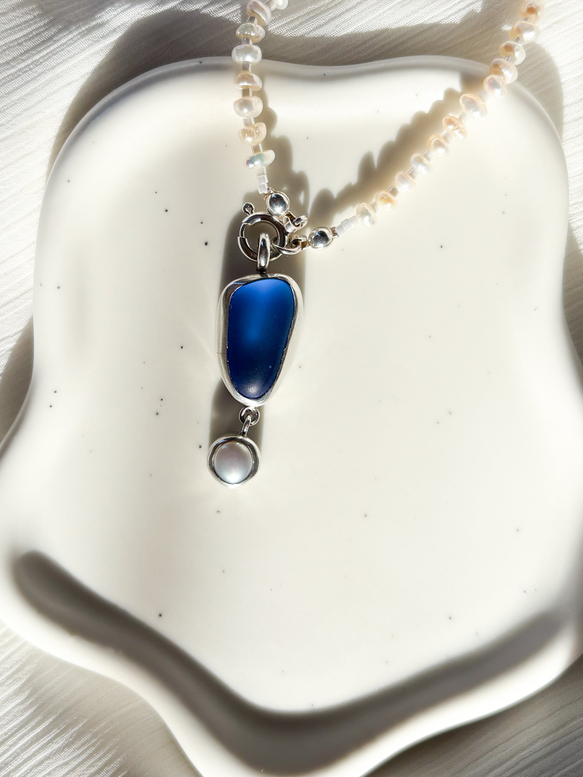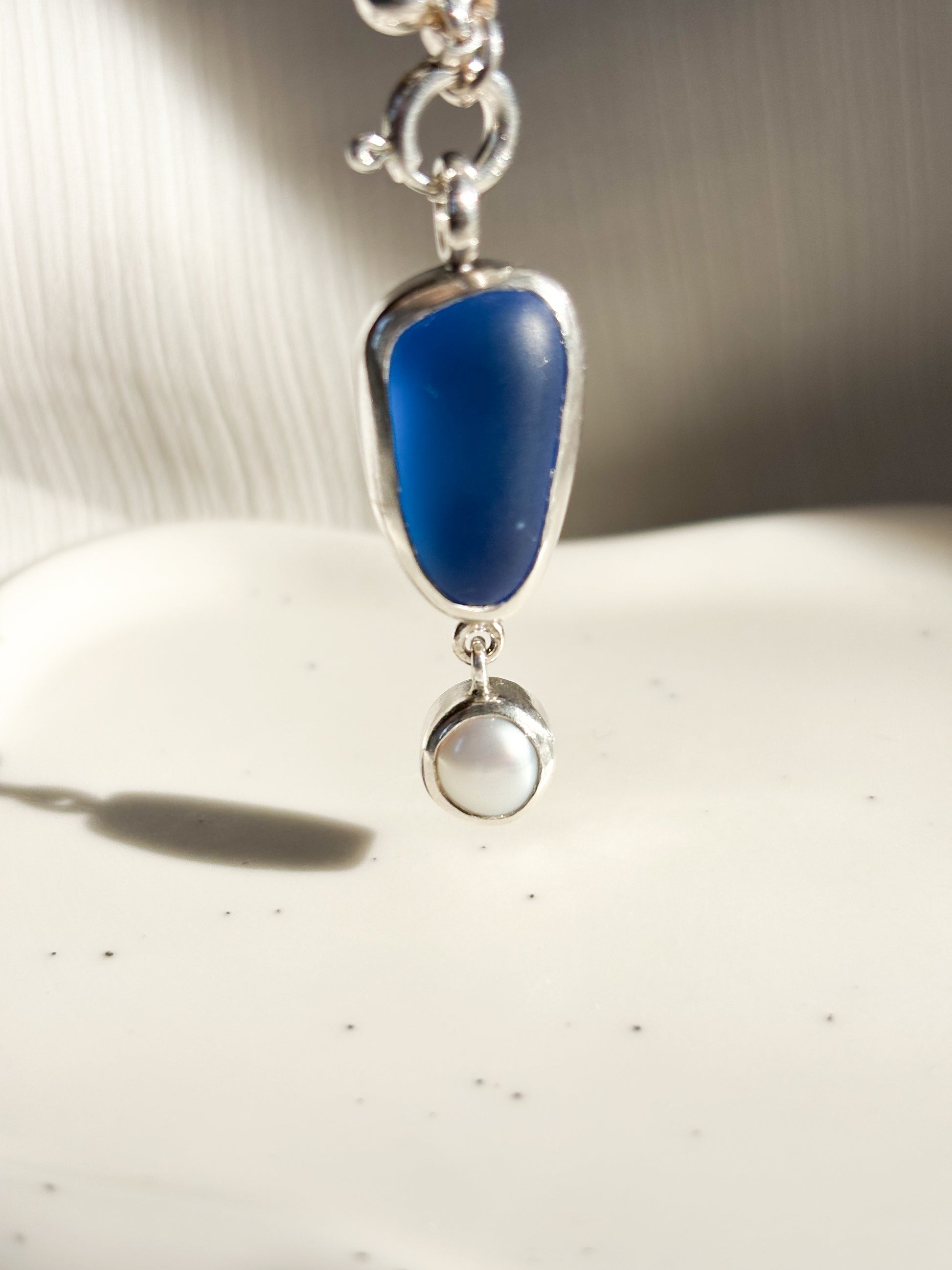 Hechos a mano en plata 950, cada pieza encierra un fragmento de vidrio marino pulido por el tiempo.
