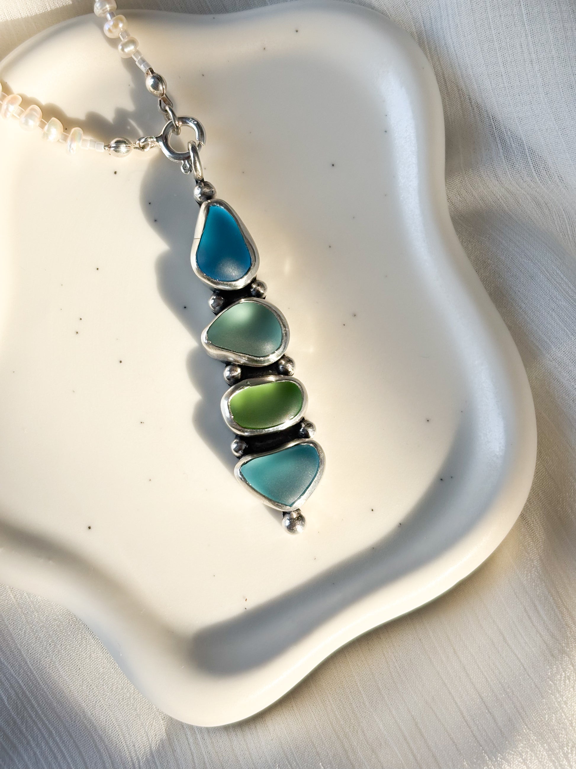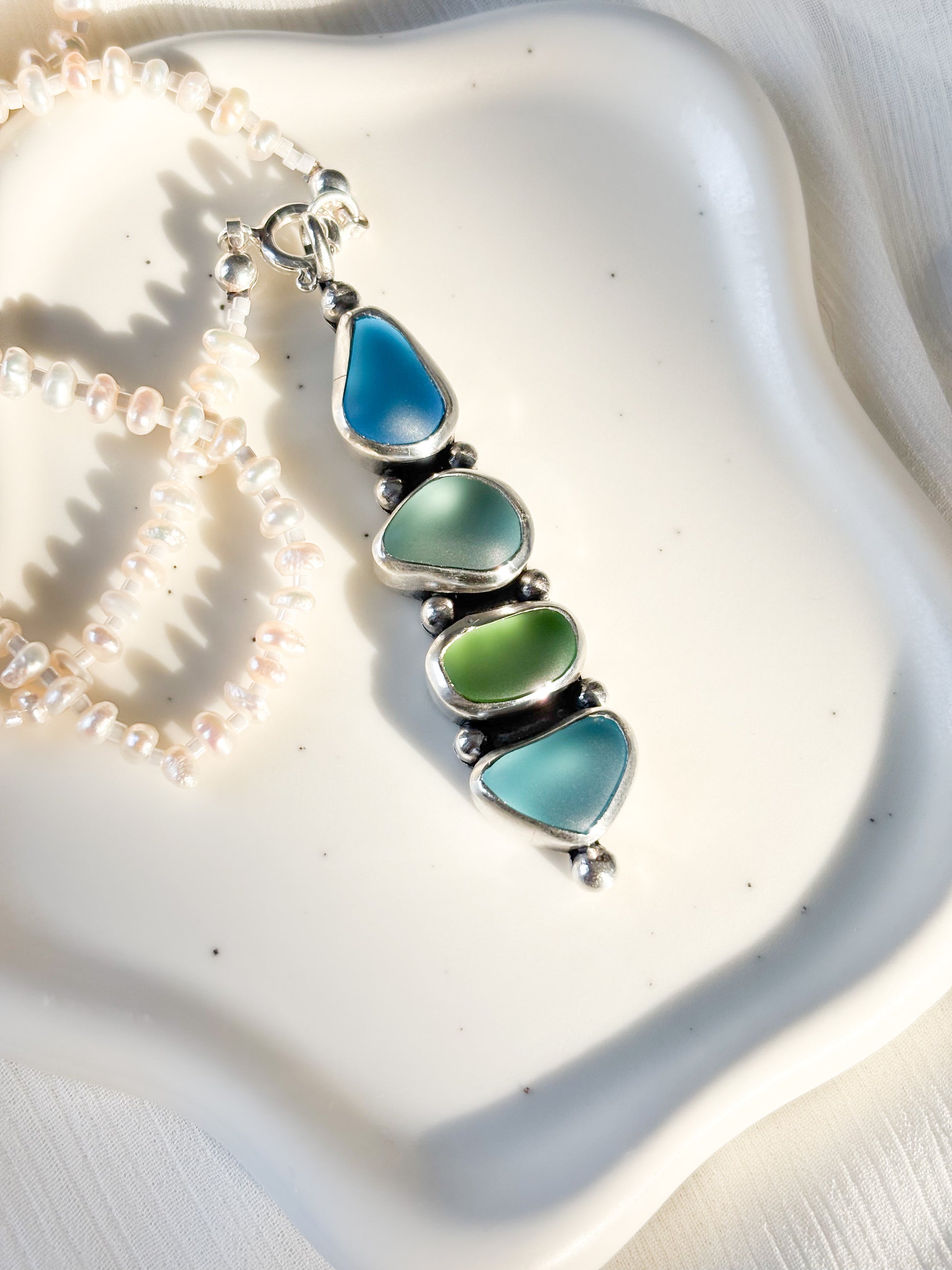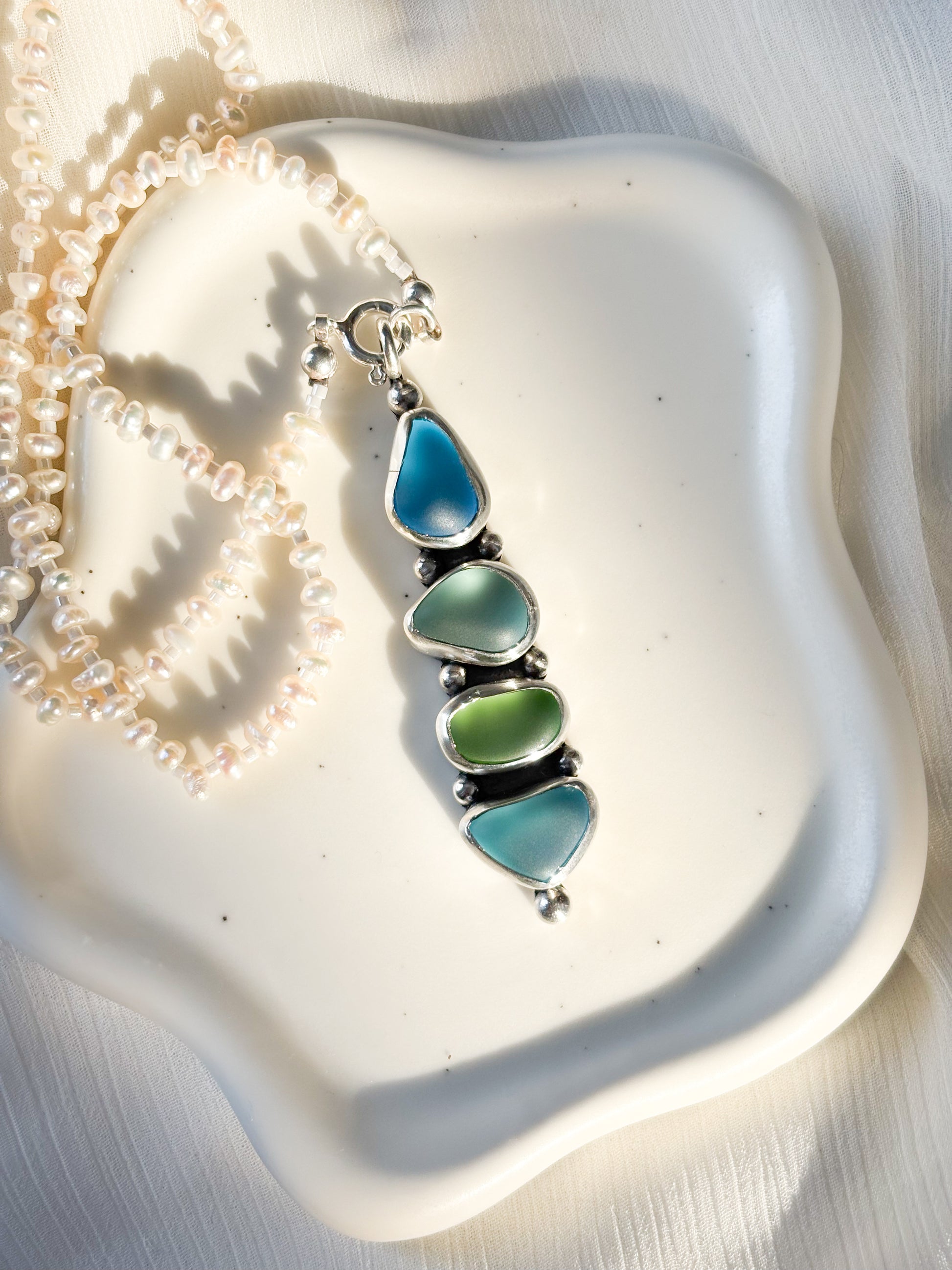 Cada fragmento de vidrio marino ha sido moldeado por el tiempo, pulido por el vaivén del agua y engastado a mano en plata 950, en un proceso de más de 10 horas de dedicación.