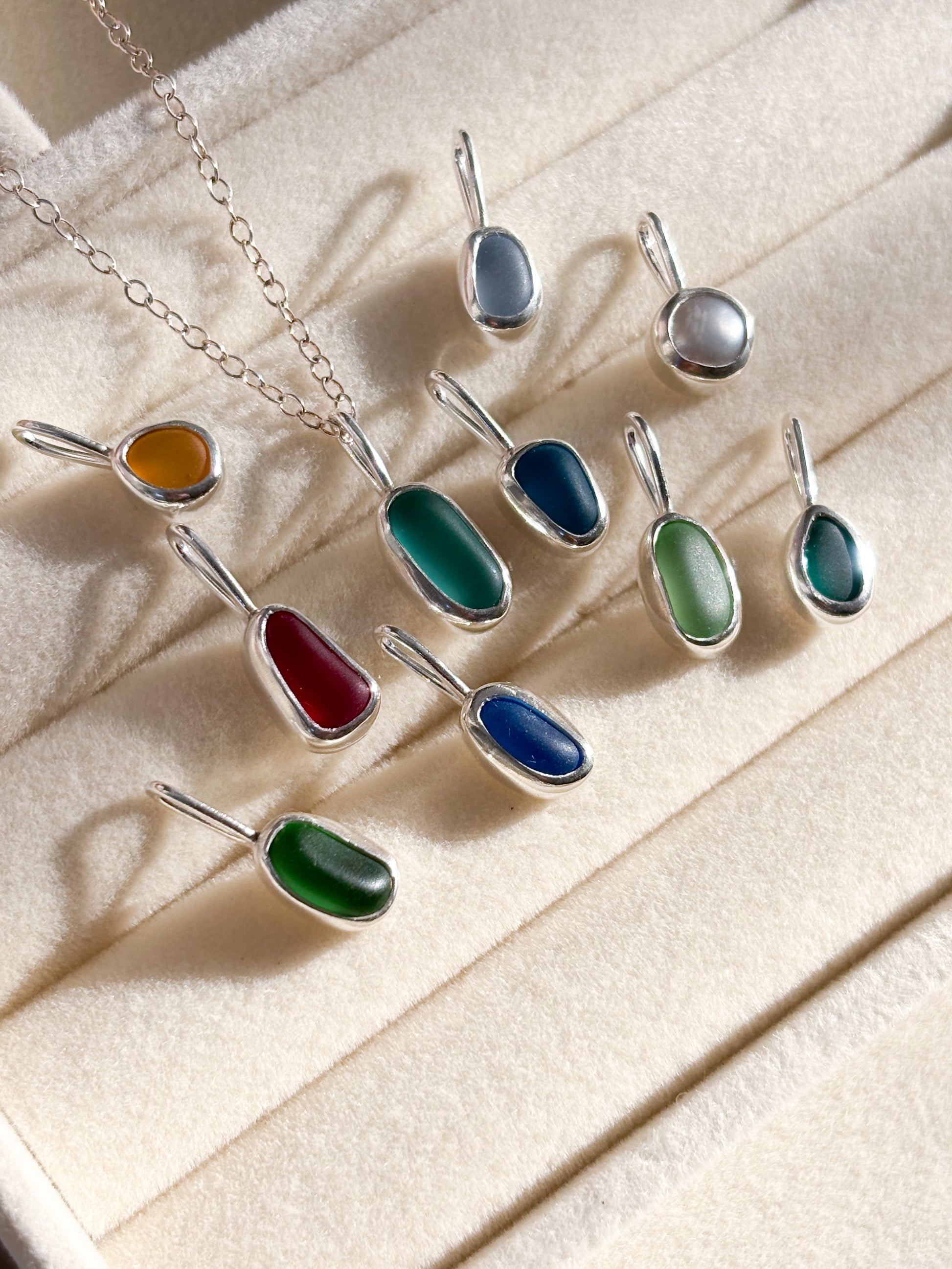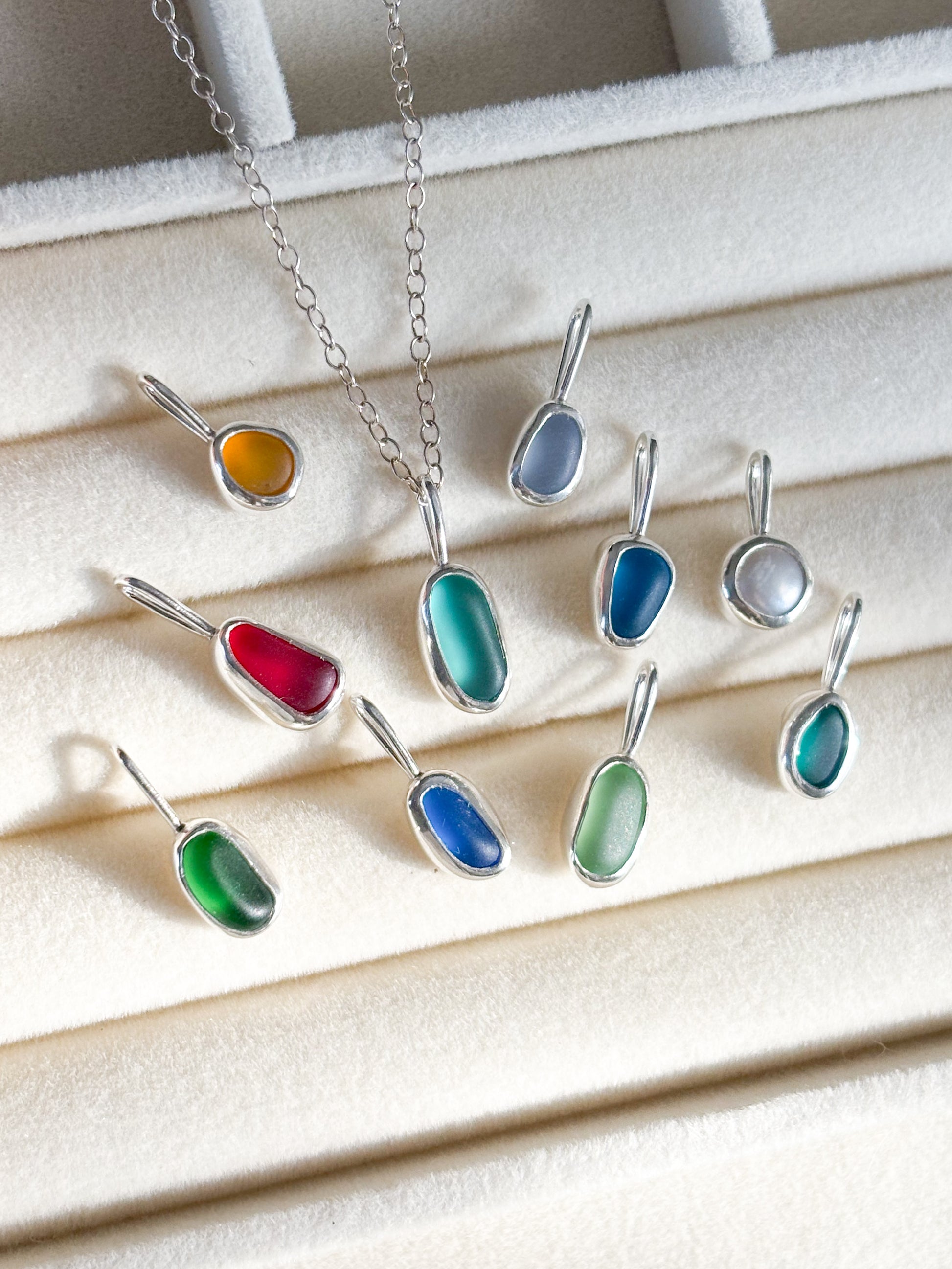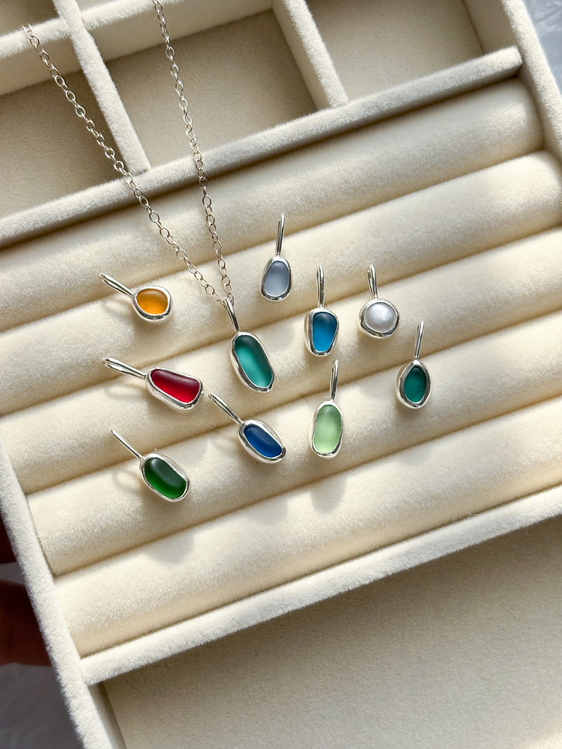 Cada colgante guarda la luz y el color de una historia distinta: la calma de una ola, la alegría de un atardecer, el misterio de las profundidades. Vidrios marinos pulidos por el tiempo, rescatados y engastados a mano en plata 950 para transformarse en pequeños tesoros llenos de vida.