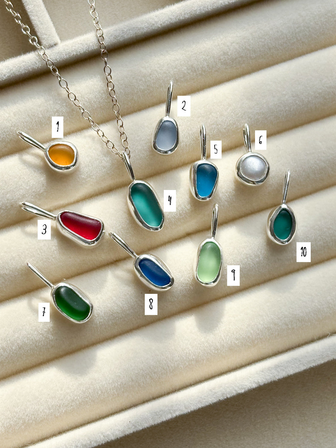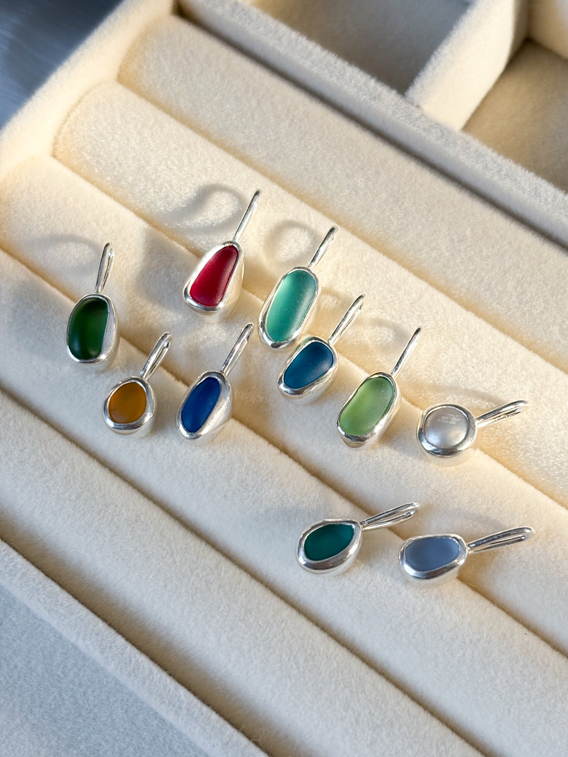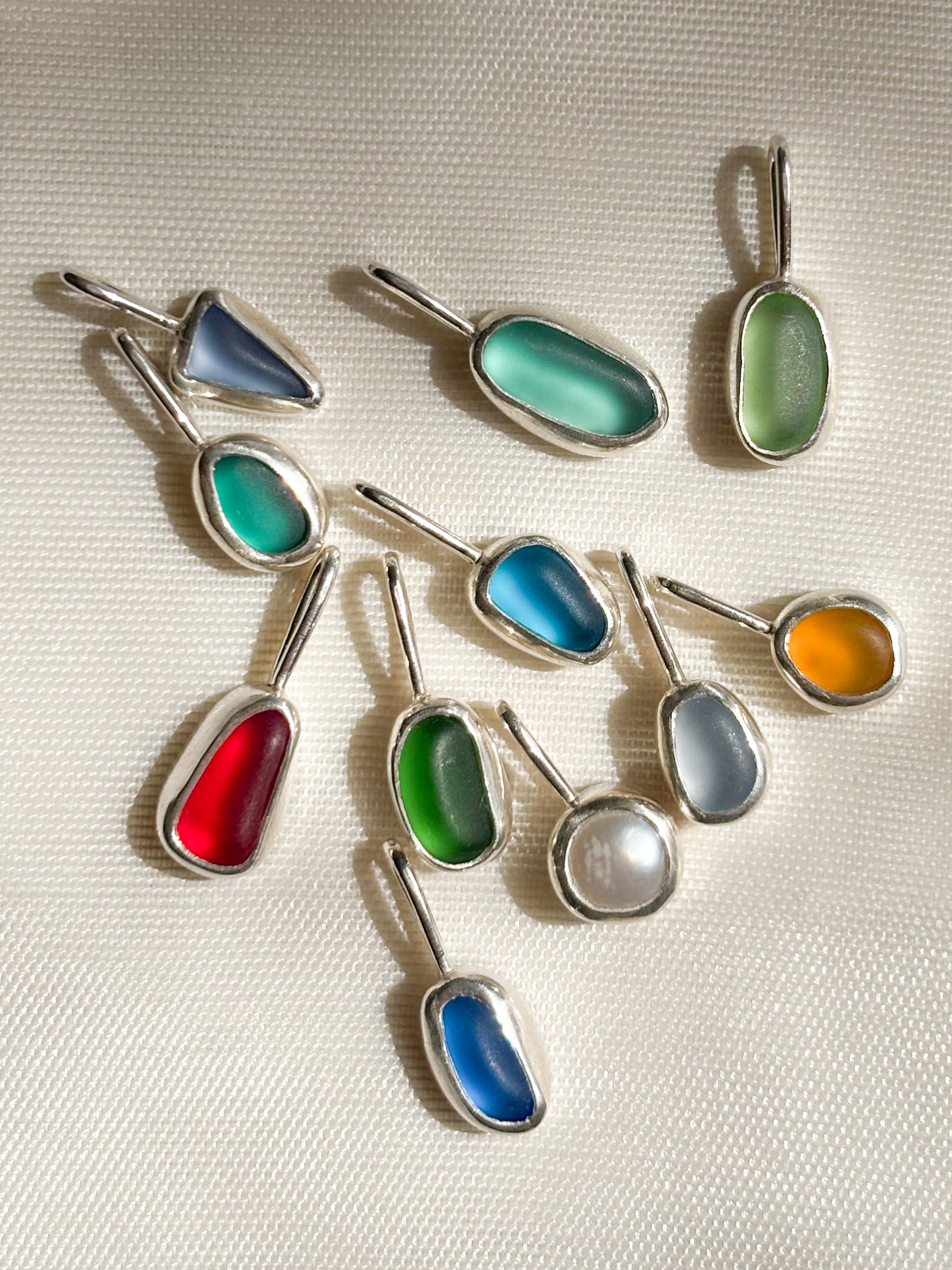 Cada colgante guarda la luz y el color de una historia distinta: la calma de una ola, la alegría de un atardecer, el misterio de las profundidades. Vidrios marinos pulidos por el tiempo, rescatados y engastados a mano en plata 950 para transformarse en pequeños tesoros llenos de vida.